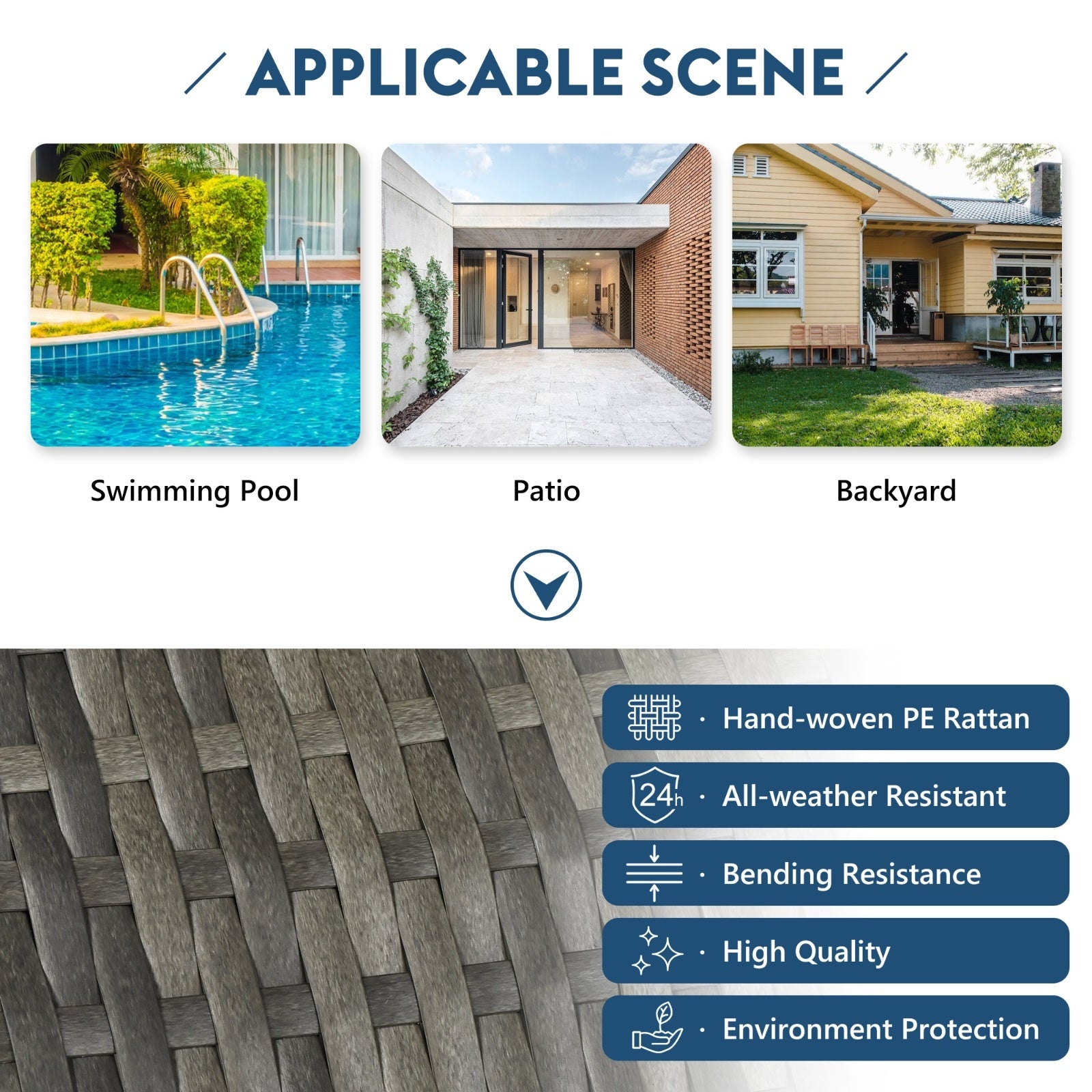 Introducing the Outdoor Sun Bed, known for its durability and style. It's crafted with high-quality PE rattan materials ensuring longevity, perfect for your outdoor relaxation. All cushions and pillows are zippered for easy cleaning. Measuring 79.9 inches in length and 52.4 inches in width it can comfortably accommodate two adults. The adjustable canopy on the lounger shields you from sunlight, allowing for the ultimate relaxation experience. The half-package stylish curved armrests provide support where needed while still exhibiting elegance. Featuring a comfortable backrest and an sloped angle, you can easily recline while enjoying the outdoors. Don't worry about bringing extra pillows as the lounger includes two large gray pillows and two colorful decorative pillows. Adjustable feet for uneven ground make you comfortable in any place. Enjoy the best of the outdoors time with this Outdoor Sun Bed!