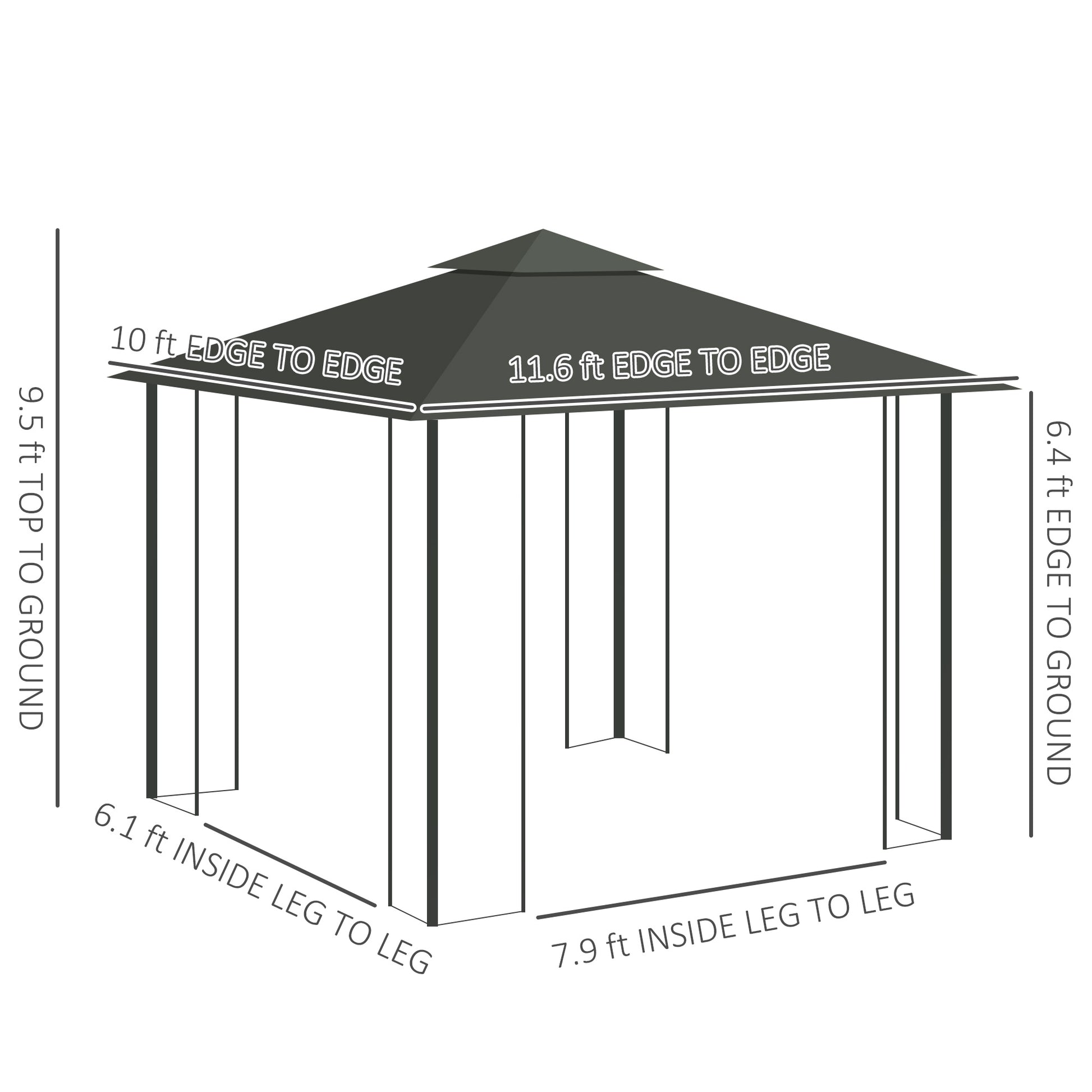 - - Outdoor Canopy Gazebo Info: Overall Dimensions: 11.6' L x 9.8' W x 9.4' H. Eaves Height: 6.4' H. Inner Size (between columns): 7.9' L x 6.1' W. Please Note: Do not leave it in windy or adverse weather conditions.