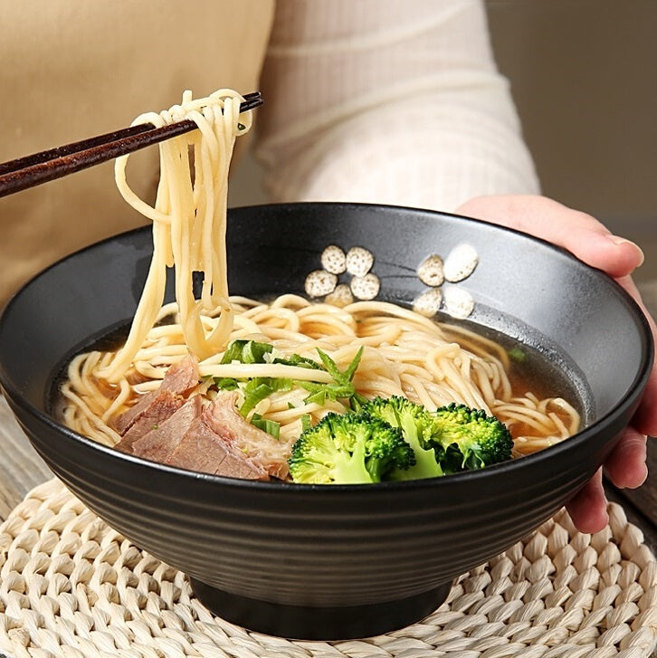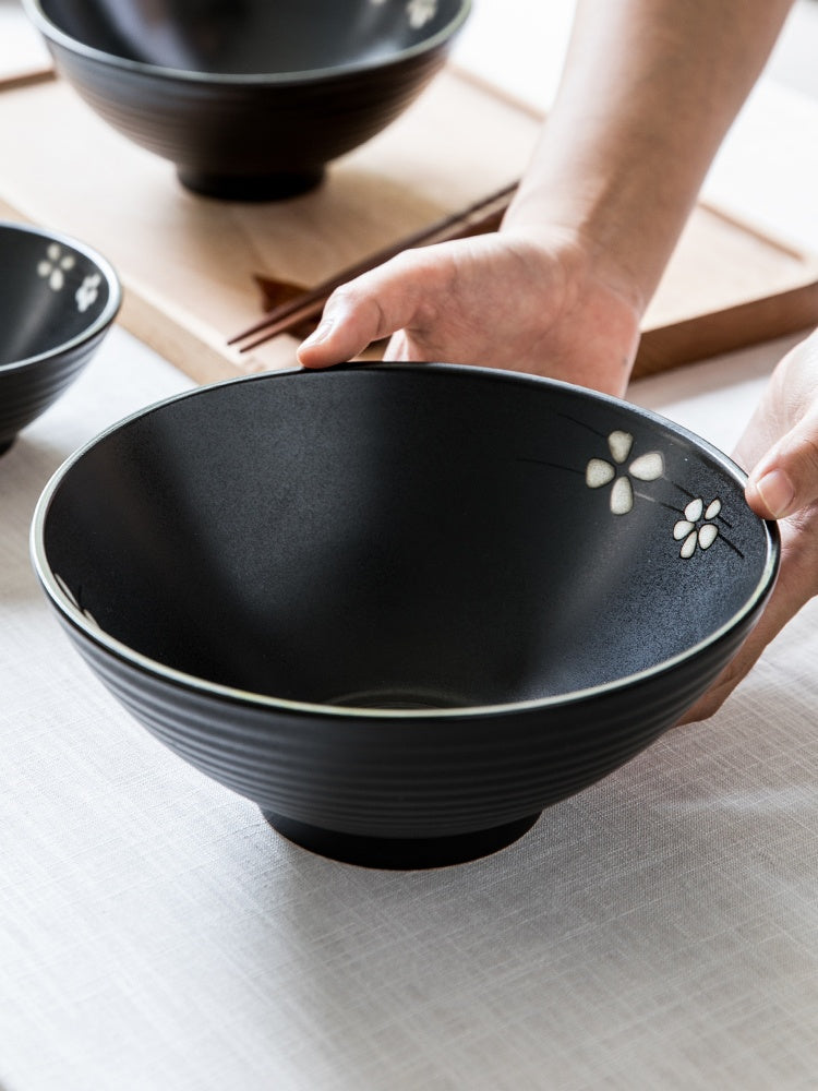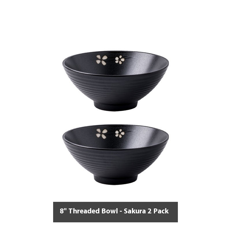 Bring a touch of Zen-inspired elegance to your dining table with our 8" Sakura Threaded Ceramic Bowl Set. Perfectly blending traditional Japanese aesthetics with a modern matte finish, these bowls are designed for both daily meals and special occasions. Each bowl features a sophisticated textured threaded exterior that provides a secure grip, while the interior is accented with a delicate, hand-drawn Sakura (cherry blossom) floral motif.