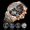 Unleash the power of precision with the POEDAGAR Luxury Executive Complication. This isn't just a watch; it’s an engineering marvel designed for the man who demands a bold, commanding presence on his wrist. Featuring a stunning contrast of rose gold and deep obsidian black, this timepiece is defined by its intricate dial that masterfully displays a perpetual calendar, moon phase, and a captivating "open-heart" window to the mechanical movement within.
