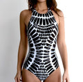 Command attention with the Eclipse High-Neck One-Piece, a swimsuit designed for the woman who views the beach as her runway. This piece features a sophisticated high-halter neckline and a captivating black-and-white graphic print that draws inspiration from organic, skeletal-like textures and modern digital art.