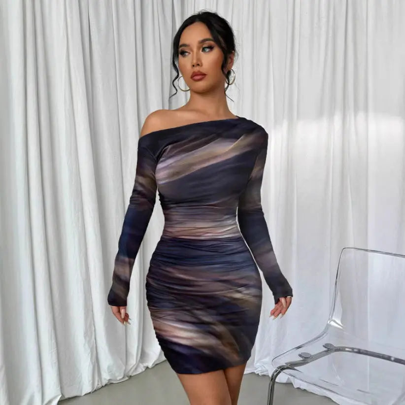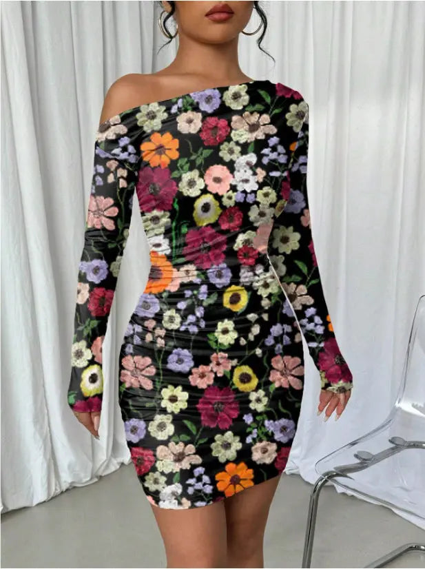 Pleated Slim Fit Long Sleeve Narrow Diagonal Collar Dress Women's Clothing
