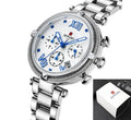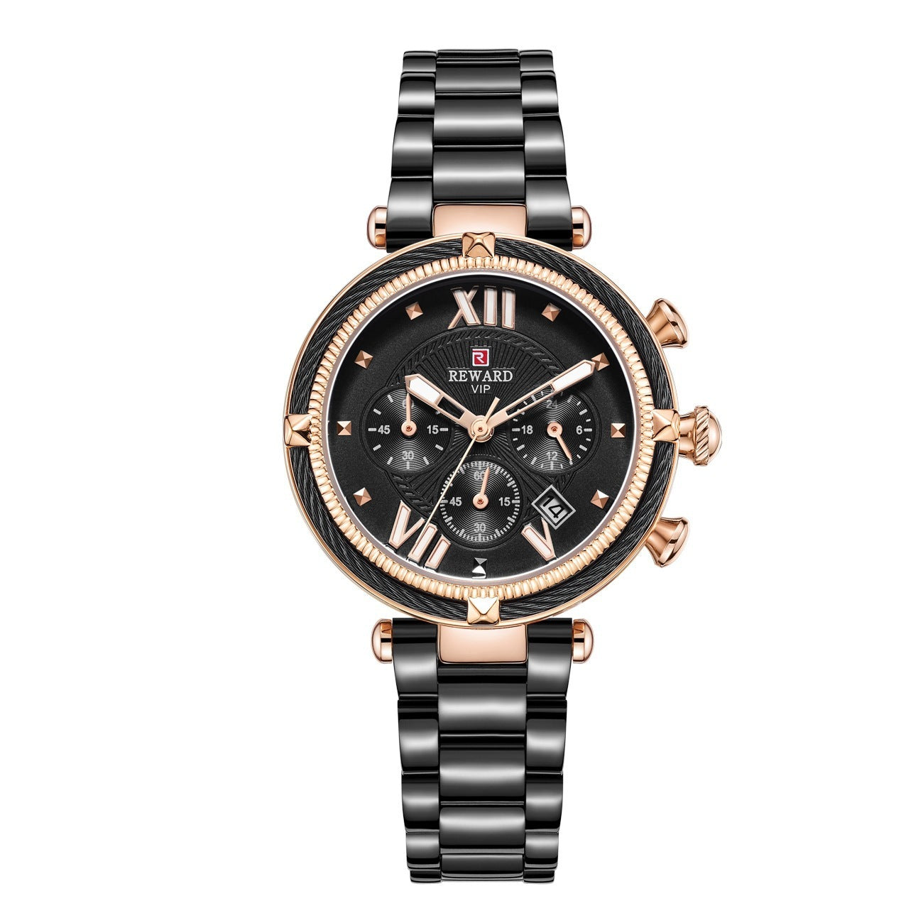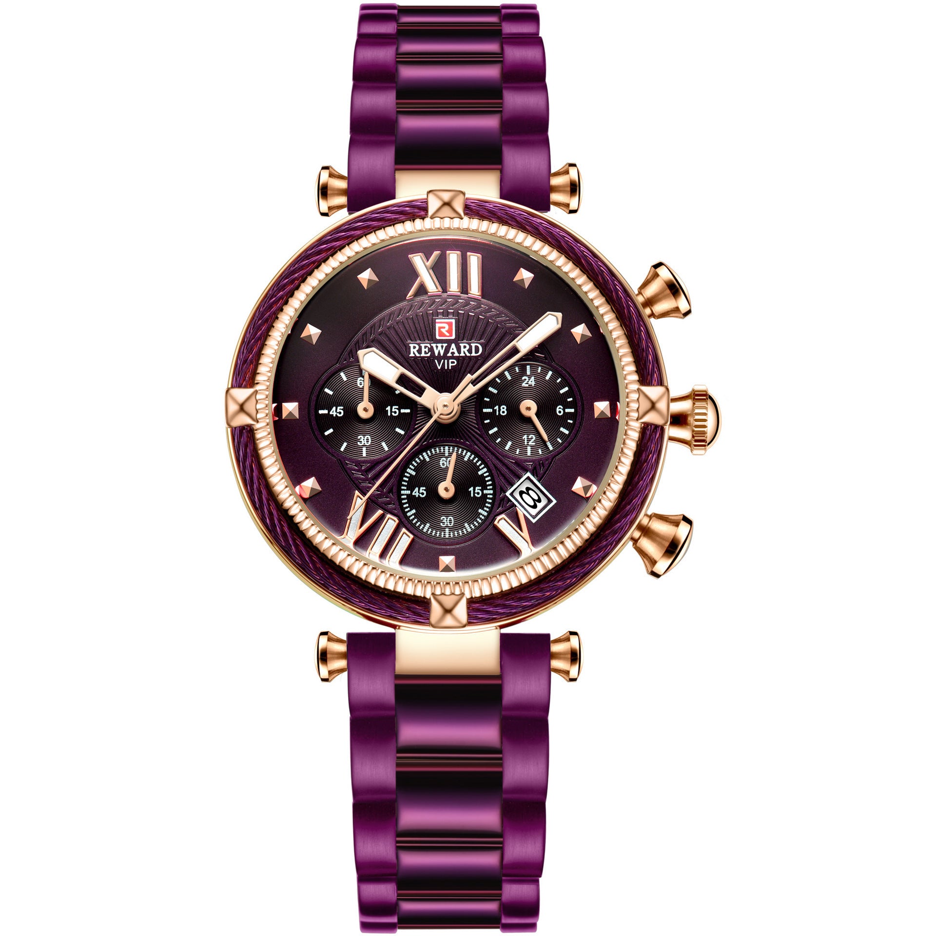 Command every moment with a timepiece designed for the woman who leads. The REWARD VIP Luxury Chronograph is a stunning fusion of precision engineering and sophisticated aesthetics. Featuring a brilliant white textured dial set against a striking rose gold-tone case and bracelet, this watch offers a commanding presence on the wrist.